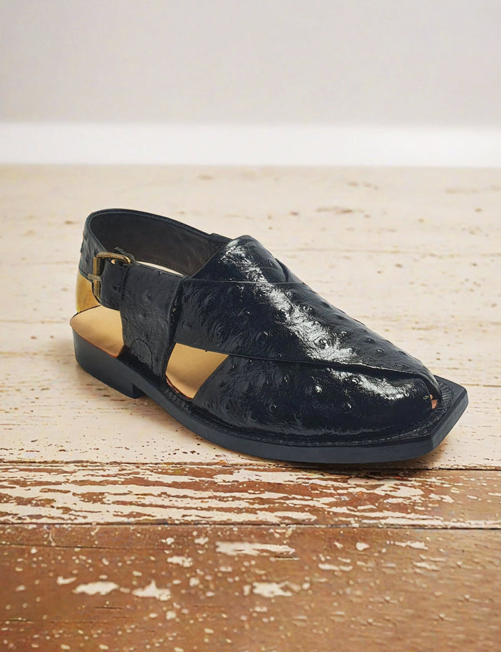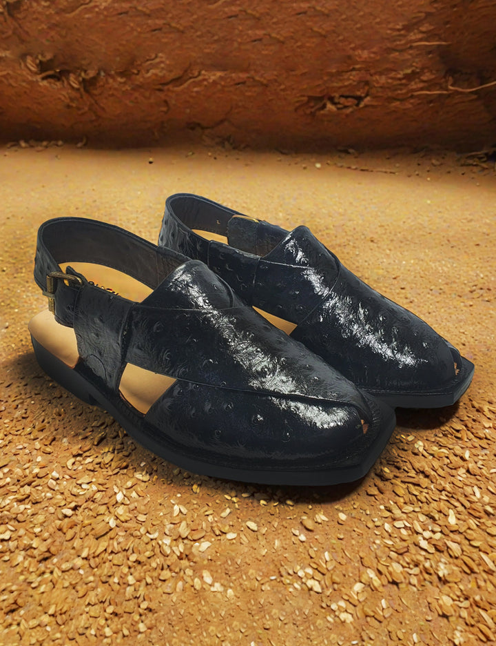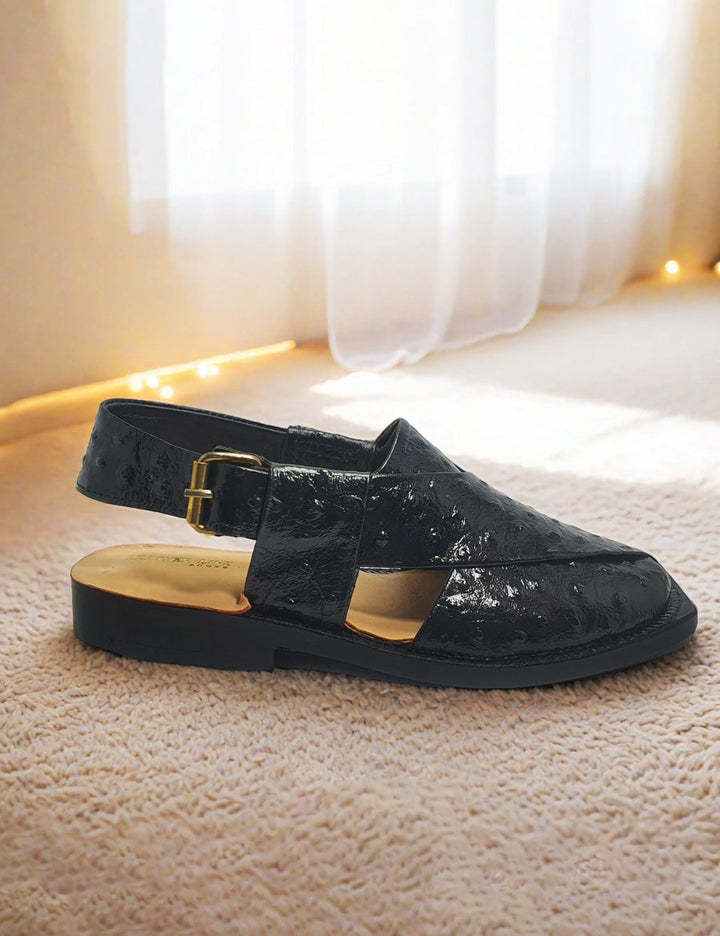 Step into timeless tradition with the Black Peshawari for Men. Crafted for comfort and durability, this classic footwear blends cultural heritage with modern style. Its sturdy sole ensures long-lasting wear, while the sleek black design complements any outfit, making it perfect for both casual and formal occasions. Elevate your wardrobe with a pair that honors craftsmanship and adds a distinguished touch to your look.