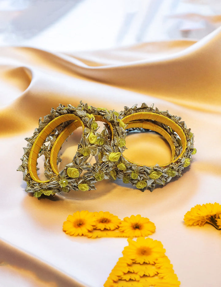 Bring a vibrant and joyful look to your outfits with these bangles! The intricate gota work on each bangle adds a splash of chic sophistication to any style. Instantly upgrade your look with these striking bangles.